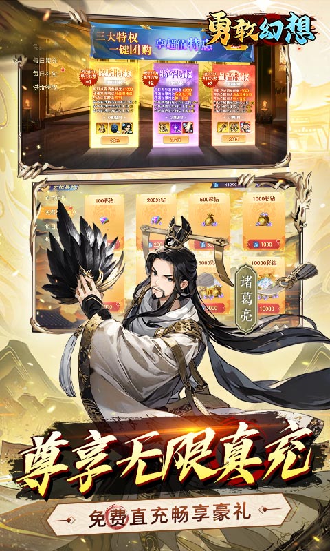 【勇敢幻想】:群雄天下0.1折免费版,每天送2000代金券。精美的美术风格,酷炫的武将及技能,给你带来不一样的游戏体验。尊享无限真充,闯关送点券,免费直充畅享豪礼。疯狂送1000抽,做任务送红将,连续登录送彩将,三国名将尽入囊中。游戏真实还原三国历史,攻城略地匡扶汉室,主公等你来战!